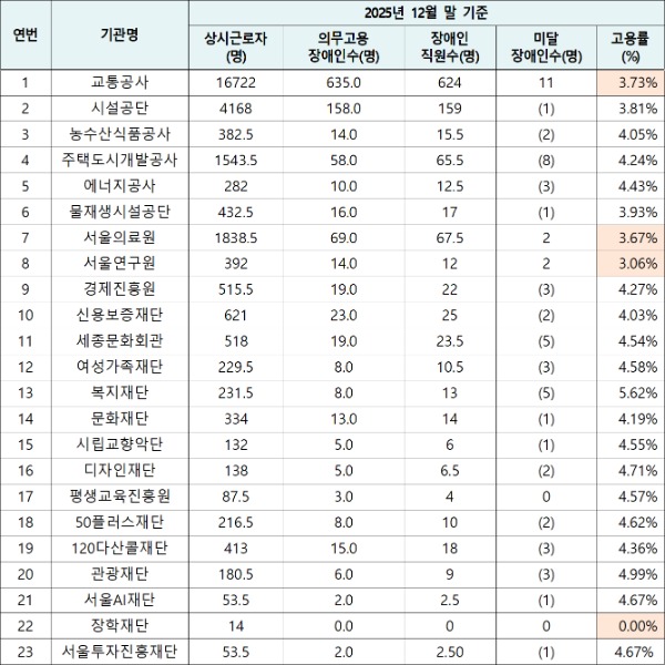 이 중,「장애인 고용촉진 및 직업재활법」에 따라 2025년 납부(2024년 분) 기준, 지방자치단체의 장애인 의무 고용률인 3.8%를 준수하지 못한 서울시 산하기관은 2024년 5곳에서 2025년 4곳으로, △교통공사(3.73%), △서울의료원(3.67%), △서울연구원(3.06%), △장학재단(0%)으로 나타났다.