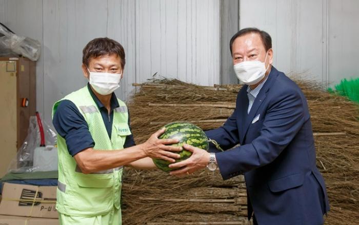 ▲ 마포구청장(유동균)이 공무관(환경미화원)에게 수박을 전달하는 모습 마포구청장(유동균)은