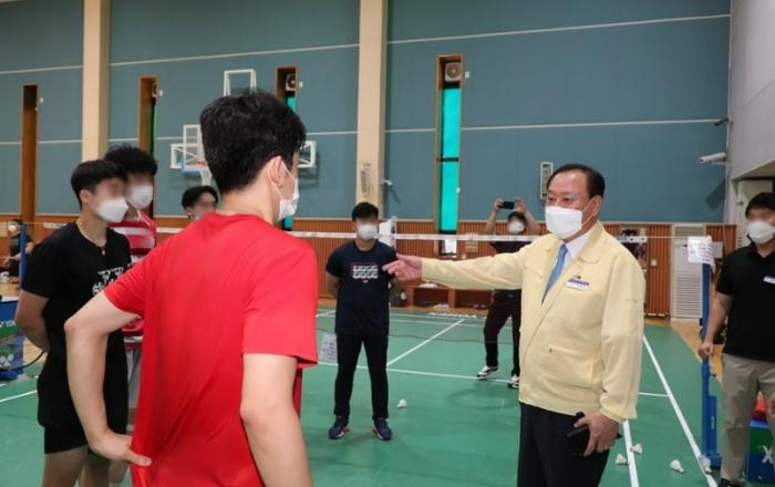 ▲ 유동균 마포구청장이 성미산체육관 방역점검을 하며 이용 구민에게 방역수칙에 대해 안내하는 모습마포구(구청장 유동균)는 수도권 사회적 거리 두기 4단계가 실시 됨에 따라 공공 체육 시설 7개소에 대해 7월 19일부터 7월 23일까지 총 5일간 방역조치 점검을 실시했다.