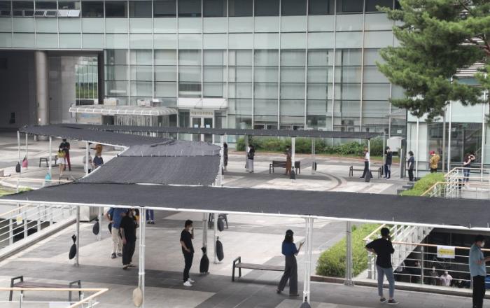 ▲ 임시 선별소에 설치된 그늘막 마포구(구청장 유동균)는 지난 5월부터 9월까지 2021년 폭염 대책 상황관리 T/F를 구성해 취약 계층을 보호하기 위해 팔을 걷어붙였다.T/F팀은 폭염 대비 구민 행동 요령 홍보, 홀로 사는 노인, 장애인