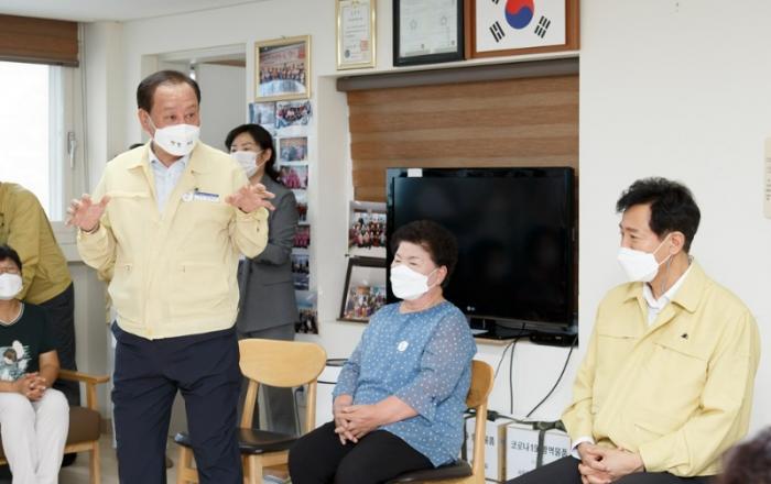 오세훈 서울 시장과 유동균 마포구청장은 마포구 합정 경로당을 방문해 코로나 19와 폭염속에 고생하고 있는 주민들과 노인들을 위로했다고 15일 마포구청은 밝혔다.마포구 경로당 155개소(자율 휴관 10개) 중 145개소가 무더위 쉼터로 운영 중인 마포구 경로당은 어르신들