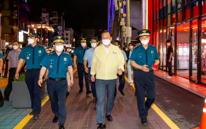 ▲ 김창룡 경찰청장(왼쪽)과 유동균 마포구청장(가운데)의 현장 점검 모습김창룡 경찰청장과 유동균 마포구청장은 홍대 클럽 거리 방역 수칙 준수 상황을 점검했고 19일 마포구청이 밝혔다.이날 점검은 현장 업소를 방문해 방역 수칙 준수를 당부하고 현장 점검 요원의 고충을 청