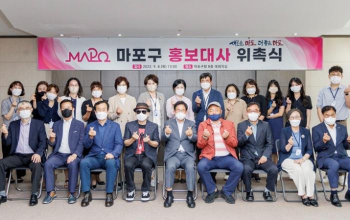 마포구는 가수 김흥국, 박상민을 ‘마포구 홍보대사’로 위촉했다고 8일 밝혔다.연예계 대표 콧수염 라인으로 꼽히는 두 사람은 여러 히트곡을 보유한 국민가수이자 솔직한 입담과 꾸준한 나눔활동으로 대중들로부터 큰 사랑을 받고 있다.▲마포구 홍보대사 위촉 기념 단체사진(앞줄