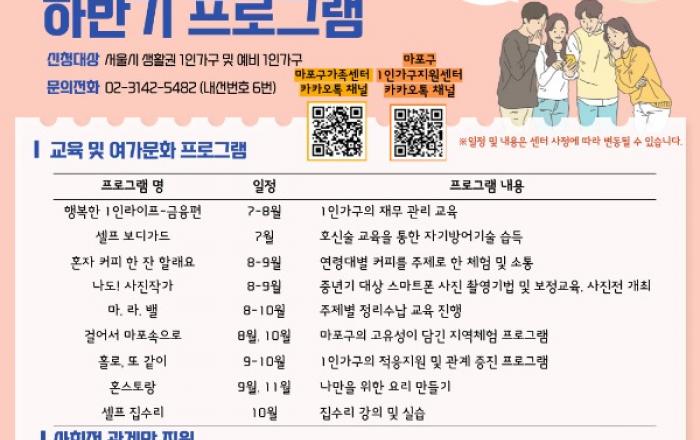 마포구는 1인 가구를 대상으로 교육 및 여가체험을 제공하는 ‘2022년 1인가구지원센터 하반기 프로그램’을 운영한다고 5일 밝혔다.혼자 사는 사람의 사회적 고립을 예방하고 다양한 분야의 역량을 키우는데 도움을 주기 위해서다.지난달 프로그램을 체험한 한 참여자는 “혼자