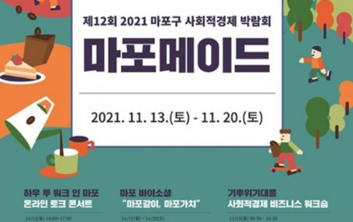 마포구(구청장 유동균)가 지역경제 활성화에 기여하고 사회적 가치를 확산시키고자 오는 13일부터 20일까지 ‘2021년 사회적경제박람회 「마포메이드(mapomade)」를 개최한다고 밝혔다. 마포구가 주최하고 마포사회적경제네트워크, (사)일상예술창작센터가 주관