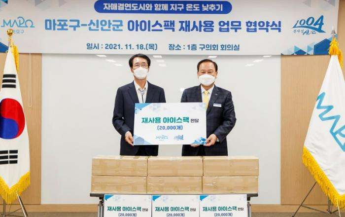 마포구(구청장 유동균)가 지난 18일 마포구청에서 신안군(군수 박우량)과 아이스팩 재사용을 위한 업무협약을 체결했다. 구는 코로나19로 인한 언택트(Un-tact) 쇼핑과 신속한 배송 인프라 확산으로 증가하는 아이스팩 사용량에 대처하고자 지난 3월부터 아이스팩 재사용