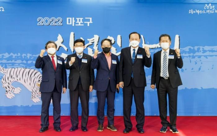 마포구(구청장 유동균)가 6일 오후 3시 임인년 새해를 맞아 ‘2022년 마포구 신년인사회’를 마포구 공식 유튜브(my Mapo)를 통해 온라인으로 개최했다.▲ 6일 마포구청 12층에서 온라인으로 진행한 ‘2022년 신년인사회’에 참석한 내빈들이 힘찬 새해를 다짐하는