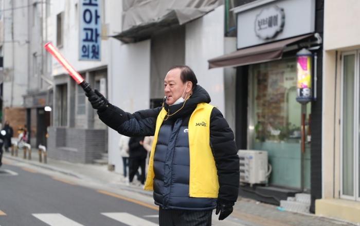 유동균 마포구청장이 8일 망원1-2 공영주차장 앞 도로 교통정리 봉사에 나섰다. 망원1-2 공영주차장 앞 도로는 주말이 되면 망원시장과 망리단길을 방문하는 시민들로 진출입로 혼잡도가 높아져 주민 불편이 야기돼 온 곳이다. 유 구청장은 지난해 12월 19일 현장을 직접