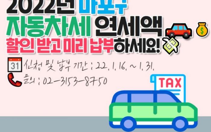 마포구(구청장 유동균)는 올해 1년분 자동차세를 1월 중 신고 납부할 경우 연세액의 9.15% 공제된 금액으로 납부할 수 있다고 밝혔다.▲ 자동차세 연납제도 홍보 이미지 = 마보구 홍보과 제공자동차세 연납제도는 1년간의 세금을 반으로 나누어 6월과 12월에 납부해야하는
