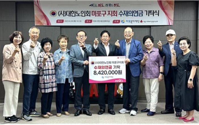 8월 29일(화) 대한노인회 마포구지회(지회장 황한규)는 집중호우로 피해를 입은 전국의 수재민을 위해 수재의연금 842만 원을 마포복지재단(이사장 이홍주)에 전달했다. 이번 후원금은 마포구 61개소 경로당을 이용하는 어르신들이 십시일반 모은 후원금이라는 점에서