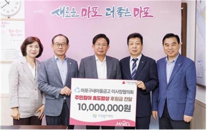 9월 6일(수) 마포구새마을금고 이사장협의회(회장 이창환)는 「75세 이상 어르신 주민참여 효도밥상」 (이하 ‘효도밥상’) 후원금 1,000만 원을 마포복지재단(이사장 이홍주)에 전달했다. 이번 후원에는 마포구새마을금고 이사장협의회, 마포공덕새마을금고, 마포역새마을