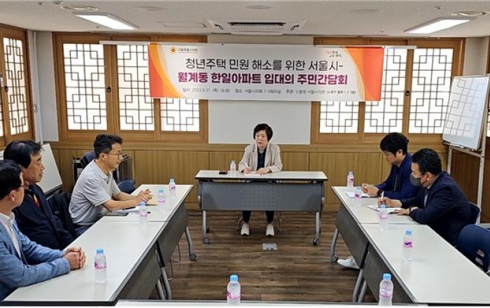 서울특별시의회 신동원 의원(국민의힘, 노원구 제1선거구,사진 가운데)은 지난 21일, 월계동 한일아파트 입주민대표회의(이하 입대의)와 서울시 관계부서와 간담회를 개최하고 월계동 청년안심주택 공사 관련 민원해소를 위한 협의를 진행했다고 밝혔다.현재 노원구 월계동 410-