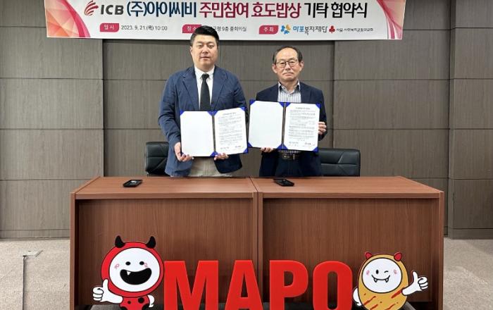 9월 21일(목) 마포복지재단(이사장 이홍주)과 ㈜아이씨비(대표이사 이한용)는 「75세 이상 어르신 주민참여 효도밥상」 (이하 ‘효도밥상’) 정기후원 협약을 체결했다. 이날 협약을 기념해 ㈜아이씨비는 일시후원금 200만 원을 마포복지재단에 전달했다.▲ ㈜아이씨비가 마포