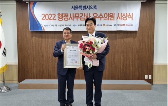 서울시의회 이종배 의원(국민의힘, 비례대표,사진 오른쪽)은 11일(화) 서울시의회 서소문청사2동 2층 제2대회의실에서 수도권일보가 주최하고 시사뉴스·파이낸셜 데일리에서 주관하는 ‘2022 서울특별시의회 행정사무감사 우수의원 시상식에서 우수의원에 선정됐다.행사를 주최한