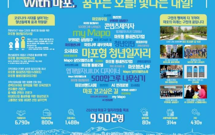 마포구(구청장 유동균)가 ‘2021 대한민국 일자리 엑스포’에 참가해 구의 우수 일자리 사업과 지역의 일자리 기관 홍보에 나선다고 14일 밝혔다. 올해로 4회를 맞이하는 ‘2021 대한민국 일자리 엑스포’는 14일부터 16일까지 서울 양재동 aT센터 제1‧