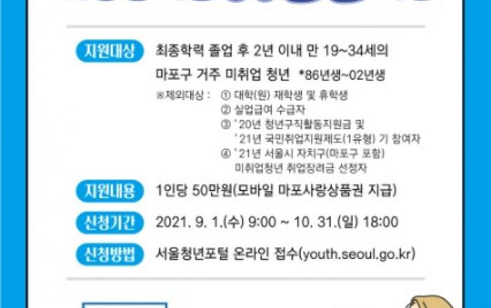 마포구(구청장 유동균)가 코로나19로 구직활동에 어려움을 겪고 있는 미취업 청년에게 취업장려금을 지원한다고 26일 밝혔다. 올해 상반기에 미취업 청년 1036명에게 50만 원 씩 총 5억 1천 8백만 원을 지급했고, 상반기 지원 조건에 해당하지 않아 신청하지 못했던 청
