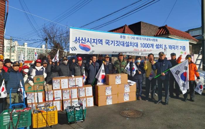 사단법인 태극기무궁화사랑회(회장:이경주)는 2월20일 오전9시30분 충남 서산시 학동에서 서산시 지역 국기깃대설치대 1000개 설치작업을 실행하고 고급형 태극기 100세트를 기증하는 행사를 성황리에 마쳤다.▲2월 20일 오전 서산시 국기깃대설치대 1000개 설치 및 태