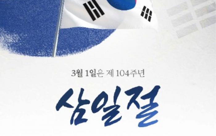 □ 오는 3월 1일은 제104주년 3·1절입니다.□ 우리 모두 나라사랑하는 마음으로 태극기를 답시다.각 가정에서는 3.1.(수) 07:00부터 18:00까지 태극기를 게양해주세요.※ 태극기는 「대한민국 국기법」 제8조에 따라 국경일은 물론이고 평일에도 매일·2
