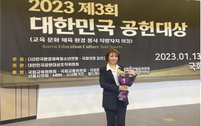 ▲서울시특별시의회 아이수루의원□ 서울시특별시의회 아이수루(더불어민주당, 비례)의원이 1월 13일 한국환경체육청소년연맹(유범진 이사장)과 국회의원 김선교 의원실이 공동주최하고, 대한민국공헌대상 조직위원회가 주관하는 2023 대한민국공헌대상 시상식에 참석했다. □ 국회 헌