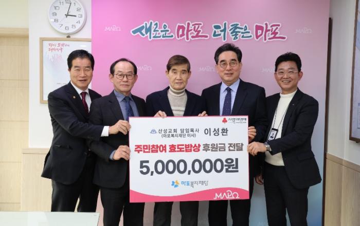마포구 아현동에 소재한 산성교회 이성환 담임목사는 지난 1월 31일(화) 마포구청을 방문하여 「75세이상 어르신 주민참여 효도밥상」 후원금 5백만 원을 마포복지재단(이사장 이홍주)에 전달하였다. ▲산성교회 이성환 담임목사 효도밥상 후원금 전달식이성환 목사는 마포복지재단