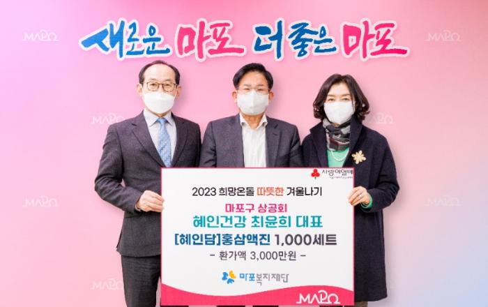 지난 1월, (주)혜인건강(대표 최윤희, 사진 오른쪽)은 마포복지재단(이사장 이홍주)을 통해 독거노인, 장애인, 한부모가정 등 소외계층 1,000가구에 자사제품 ‘혜인담 홍삼액진’을 전달하였다. 마포구 도화동에 위치한 혜인건강(주)은 1995년 설립된 건강식품 유통