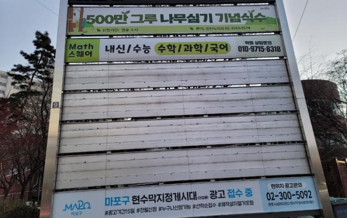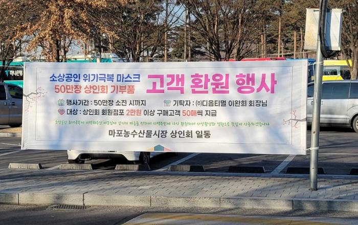 ▲마포농수산물시장 상인회가 주차장에 게시한 마스크 배부 현수막마포농수산물시장 상인회(회장:정양호)가 무상으로 기부받은 물품을 임의로 조건을 붙여 사용해 물의를 빚고 있다.마포농수산물시장 상인회는 올해 2월 ㈜디옵티멀 (대표:이완희)로부터 마스크 50만장을 기부받았다.