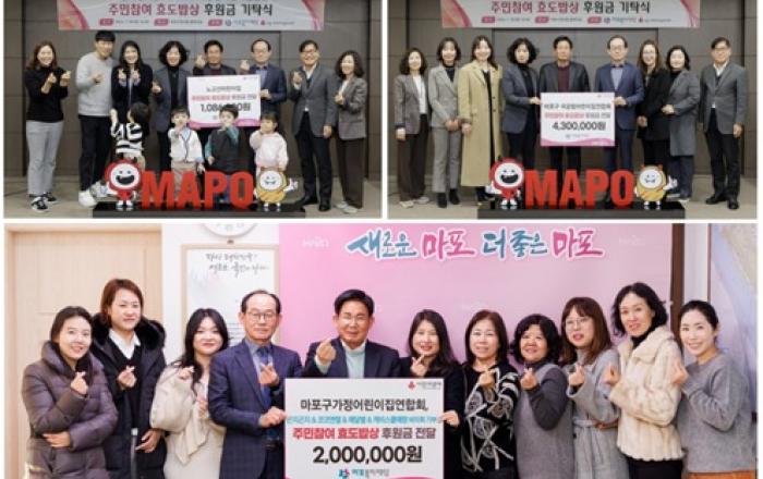 “마포구 어린이들의 작은 손길이 모여 큰 나눔으로.” “마포복지재단, 효도밥상 사업으로 마포구 효(孝) 문화 증진에 앞장서”(시계 방향) 노고산어린이집, 마포구 국공립어린이집연합회, 마포구가정어린이집연합회가 ⌜75세 이상 어르신 주민참여 효도밥상⌟ 후원금