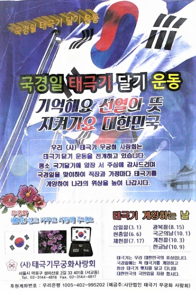 한편, (사)태극기무궁화사랑회는 태극기뿐 아니라 전 국민 무궁화 심기운동(1가구 한 그루 이상 가꾸기)과 작년부터는 전국 경로당 어르신들에게 태극기 배지 나누어주기 운동. 옥상 국기 게양대 설치 운동도 함께 진행한다.
