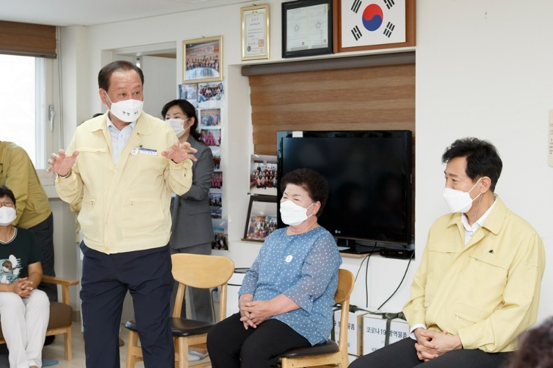 오세훈 서울 시장과 유동균 마포구청장은 마포구 합정 경로당을 방문해 코로나 19와 폭염속에 고생하고 있는 주민들과 노인들을 위로했다고 15일 마포구청은 밝혔다.