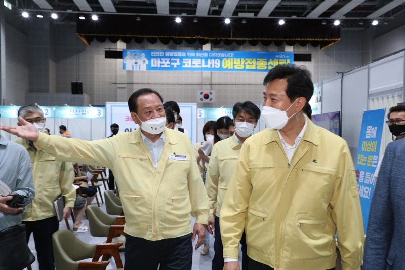 오세훈 시장은 유동균 마포구청장과 함께 마포구민체육센터내 코로나19 예방접종센터를 방문, 직원을 격려하고 방역 대책 상황을 점검했다.