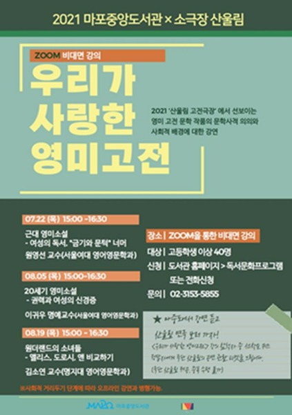 7월 22일부터 8월 19일까지 총 3회에 걸쳐 온라인 플랫폼인 ‘줌(Zoom)’을 통해 비대면(온라인)으로 「우리가 사랑한 영미고전」 강의할 계획이다.