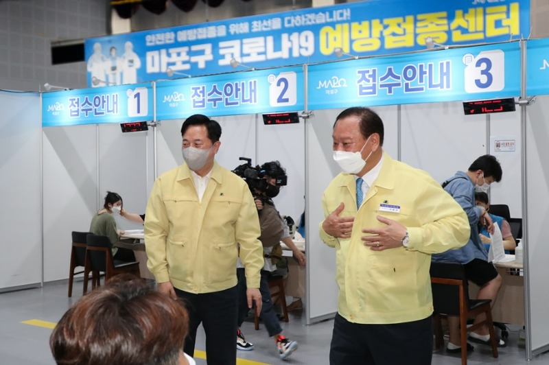 유동균 마포구청장은 김두관 의원과 함께 코로나19 접종센터를 방문해 의료진과 주민들을 격려했다고 26일 밝혔다.