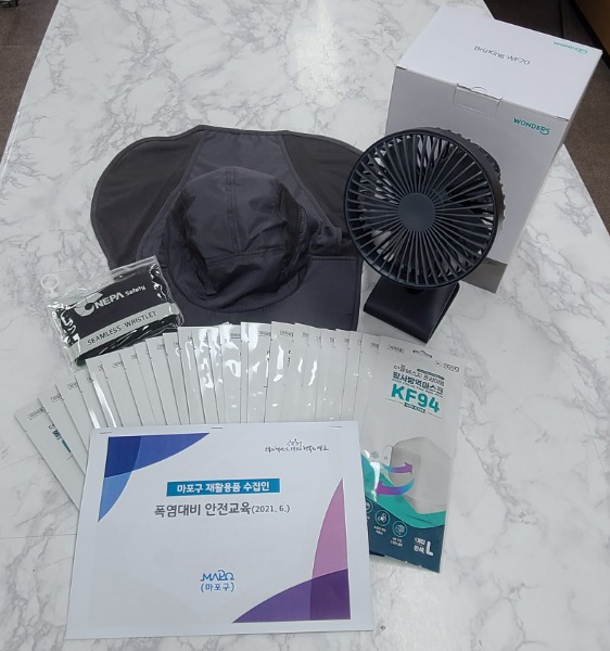 이번 폭염 대비 안전 용품은 손수레에 부착할 수 있는 선풍기, 목 뒤까지 덮개가 있는 모자, 신축성 좋은 쿨토시로써, 야외 활동이 많은 재활용품 수집인에 대한 마포구의 세심한 배려가 돋보인다.