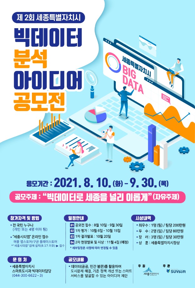 이번 공모전은 지난해 이어 올해 두 번째로 개최하는 것으로, 주제는 ‘빅데이터로 세종을 널리 이롭게’이며 공공·민간데이터를 활용한 도시문제 해결방안이나 스마트서비스를 자유롭게 제안할 수 있다.