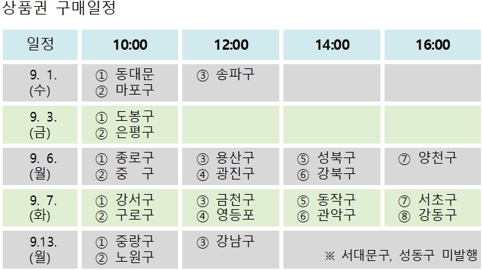 9월 1일(수)부터 13일(월) 중 서울시내 23개 자치구(서대문구, 성동구 제외)가 판매를 시작하며, 자치구별로 날짜와 시간을 달리해 상품권 구매앱 동시접속자수를 최대한 분산시킬 계획이다.