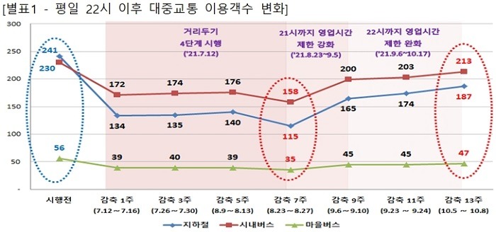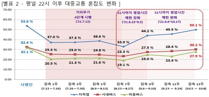 평일 22시 이후 대중교통 이용객수는 감축 운행 후 감축 운행 전과 비교하여 35% 감소세를 유지하였으며, 식당·카페 매장 내 취식가능 시간을 21시로 제한(8.23 시행) 이후 지하철 241천명→115천명(△52.4%), 시내버스 230천명→158천명(△31.3%), 마을버스 56천명→35천명(△37.3%)으로 최대 감소하였다.