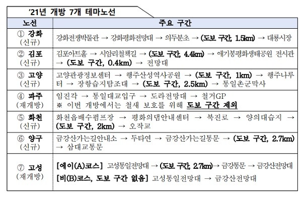 정부가 ‘디엠지(DMZ) 평화의 길’ 강화, 김포, 고양, 파주, 화천, 양구, 고성 등 7개 테마노선을 개방한다.