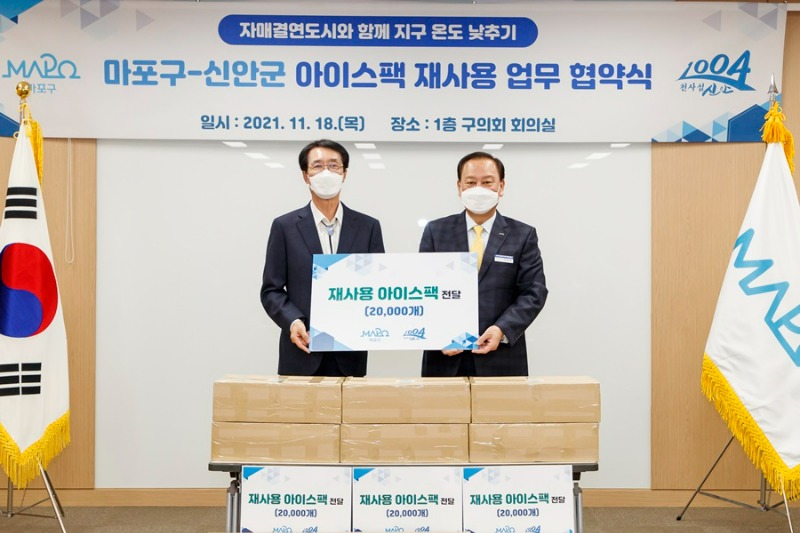 마포구(구청장 유동균)가 지난 18일 마포구청에서 신안군(군수 박우량)과 아이스팩 재사용을 위한 업무협약을 체결했다.