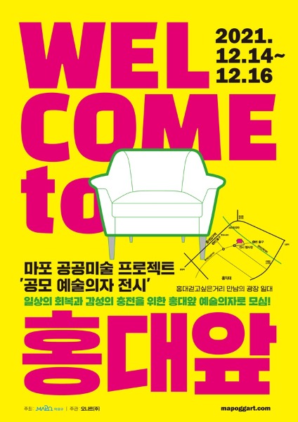 마포 지역 화합을 위한 공공미술 프로젝트로 실시되는 이번 예술의자 전시는 ‘WELCOME to 홍대앞’라는 주제로 코로나19로 지쳐있는 구민과 홍대 앞 상인을 위로하고, 지역에서 활동하는 예술가들에게 전시 기회를 제공하고자 마련됐다.