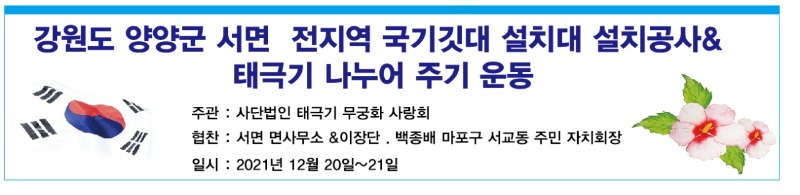 사단법인 태극기 무궁화 사랑회 (회장: 이경주)는 지난 20,21일 2일간 강원도 양양군 서면지역(면장:정병태)으로 태극기 깃대 설치 및 태극기 나누어 주기 봉사활동을 전개했다. 이경주 회장, 비롯한 회원 7명과 서면 면사무소와 이장단이 함께 참여하여 서면을 동,서로 나누어 다같이 1500개의 태극기 깃대 설치대를 설치하고 300여개의 태극기를 배부하는 활동을 펼쳤다. 서면 면사무소와 거주민들의 환영을 받으며 행사는 잘 마무리 되었다.