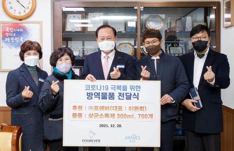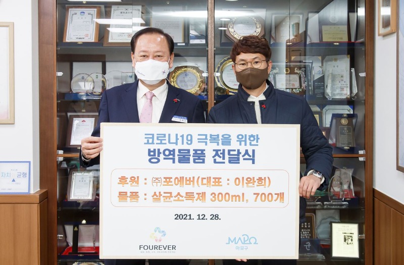㈜포에버(대표 이완희)가 28일 마포구(구청장 유동균)에 코로나19 극복을 위한 방역물품을 기탁했다.