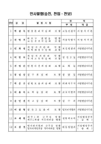 마포구청 2022년 상반기 4ㆍ5급 승진 및 전보 인사발령 발표 이우성 기자 발행 2021-12-30 13:36 글자작게 글자크게 Facebook Twitter band 네이버블로그 카카오스토리 카카오톡 마포구청(구청장 유동균) 은 30일 8층 2022년 상반기 4ㆍ5급 승진 및 전보 인사발령 명단을 발표했다.▲ 마포구청 전경 = 뉴스젠▲ 마포구청 4ㆍ5급 승진 및 전보 인사발령 명단 <저작권자 ⓒ 뉴스젠, 무단 전재 및 재배포 금지> 이우성 기자 다른기사보기