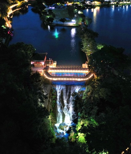 작년 8월 의림지 폭포의 자연미와 야간 경관조명의 조화로움을 갖춘 용추폭포 인도교 개선사업을 마치고 대중에 첫선을 보인 의림지 용추폭포 유리전망대는 다리 난간에 분수와 경관조명을 설치해 야간에도 폭포의 비경을 감상할 수 있도록 조성했다.