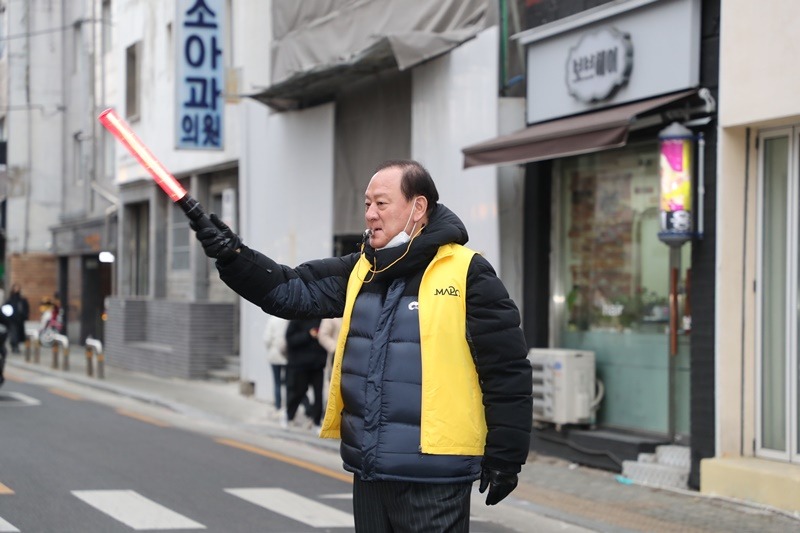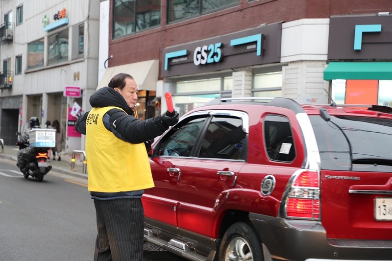 유동균 마포구청장이 8일 망원1-2 공영주차장 앞 도로 교통정리 봉사에 나섰다.