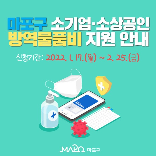 마포구(구청장 유동균)는 다음달 25일까지 방역 패스 의무적용 업종을 운영하는 소기업과 소상공인을 대상으로 방역물품비를 최대 10만 원까지 지원한다고 밝혔다.