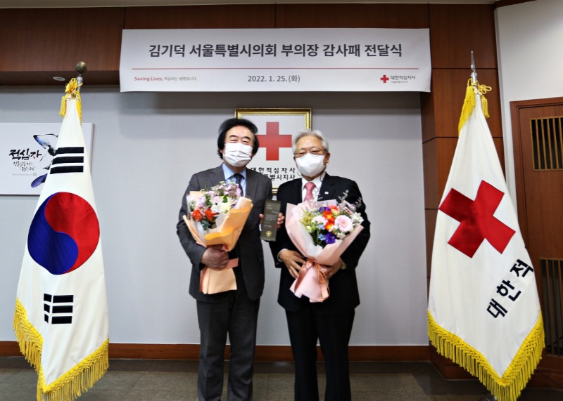 □ 서울특별시의회 부의장인 김기덕 시의원(더불어민주당·마포4, 사진 왼쪽)은 25일(화) 대한적십자 서울특별시지사(회장 김홍권)으로부터 적십자 회비모금에 앞장선 공로로 감사패를 받았다.