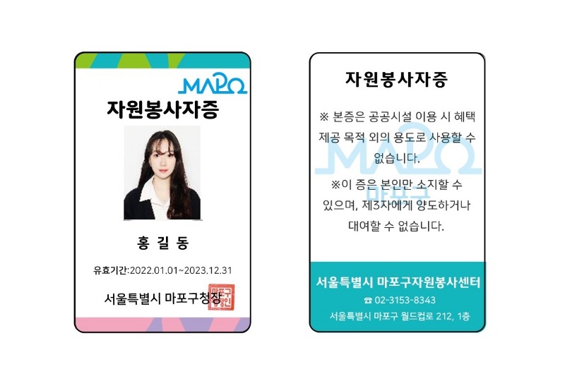 발급 대상은 마포구 소속 자원봉사자 중 발급일 기준 전년도 100시간 이상 자원봉사 활동한 자이며, 발급 방법은 신청서를 작성해 신분증과 본인 사진을 지참 후 마포구 자원봉사센터(월드컵로 212, 마포구청 1층)를 방문하면 된다.
