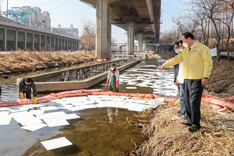 기름 유입사고는 지난 2. 11. 서대문구 연가교 인근 우수관로에서 하천에 유입된 것으로 사고발생 즉시 마포구 환경과와 치수과 관계 공무원이 현장으로 달려가 오탁방지막을 설치하고 기름때 제거 작업 활동을 지속해 왔다.