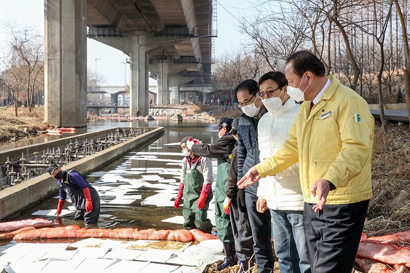 유동균 마포구청장은 12일 오전 추운 날씨에도 불구하고 홍제천 내 기름때 제거 작업에 힘쓰는 관계자들을 격려했다.