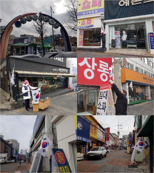 이경주 회장을 비롯한 태극기 무궁화 사랑회 회원들이 참여하여 태극기를 게양할 수 있도록 국기깃대설치대가 없는 곳을 중심으로 건물마다 설치작업을 진행하고 각 가정 및 상가에 방문하여 태극기가 필요한 인근 주민들에게 태극기와 태극기 뱃지를 무료로 배부했다.